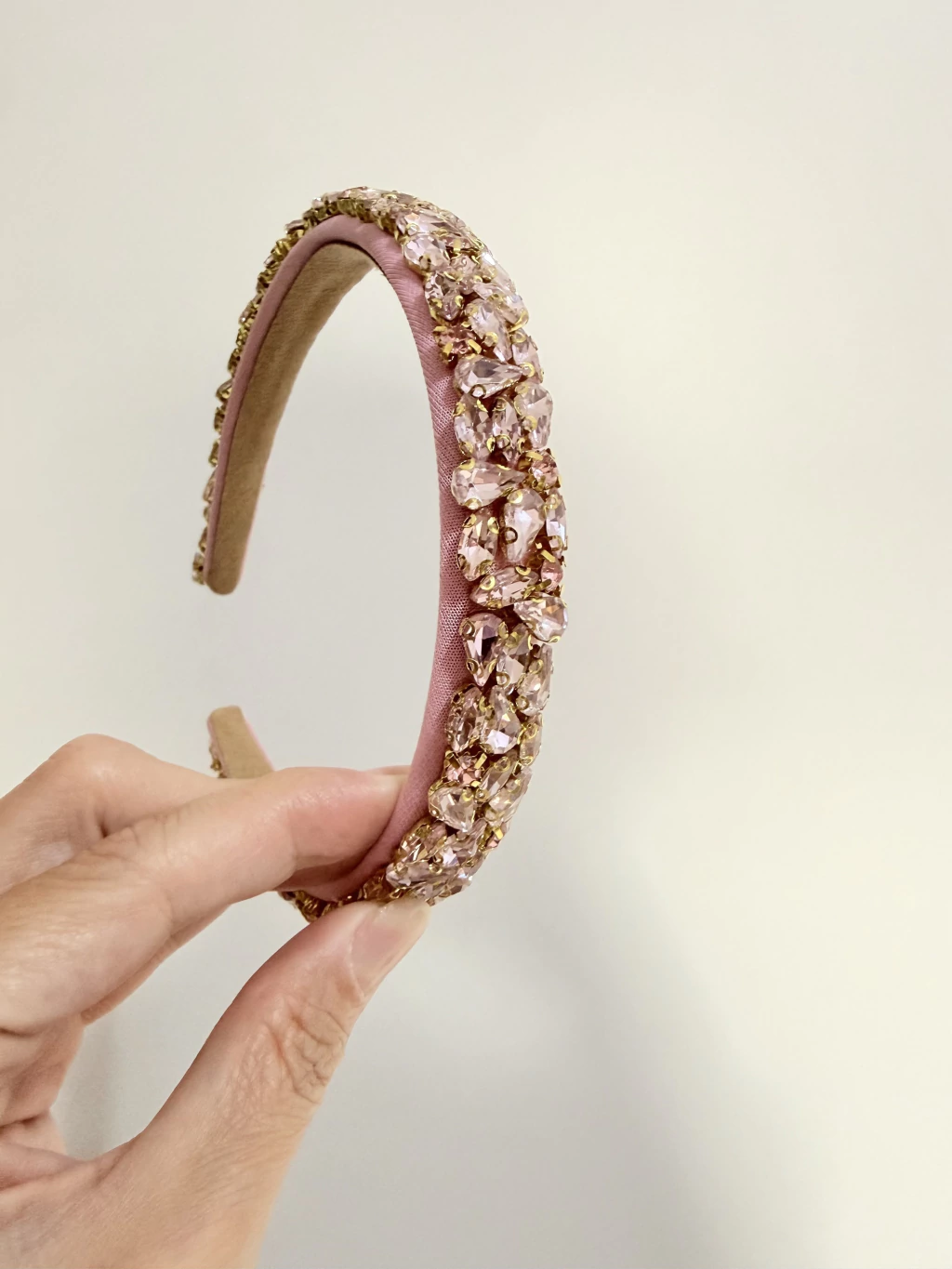 Tiara com 1,8 cm de largura, totalmente revestida por pedrarias delicadas que cobrem toda a extensão da haste. Seu desenho minucioso cria a impressão de que as pedras foram bordadas diretamente sobre a cabeça, formando um visual contínuo, elegante e muito bem acabado. Forrada internamente, oferece conforto, permitindo o uso por longas horas sem apertar ou incomodar.